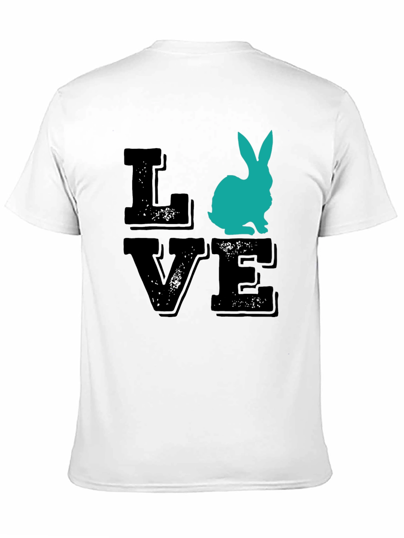 Muestra tu amor por los conejos con esta moderna camiseta negra para hombre. Presenta un diseño llamativo con la palabra "LOVE" apilada verticalmente, donde la letra "O" es reemplazada por una adorable silueta de un conejo en color aguamarina. Fabricada con un tejido suave y cómodo, esta camiseta es ideal para uso casual diario. Perfecta para los amantes de los animales, Pascua o simplemente para añadir un toque divertido a tu guardarropa. ¡Combínala con tus jeans o pantalones cortos favoritos para un look relajado y lleno de estilo!