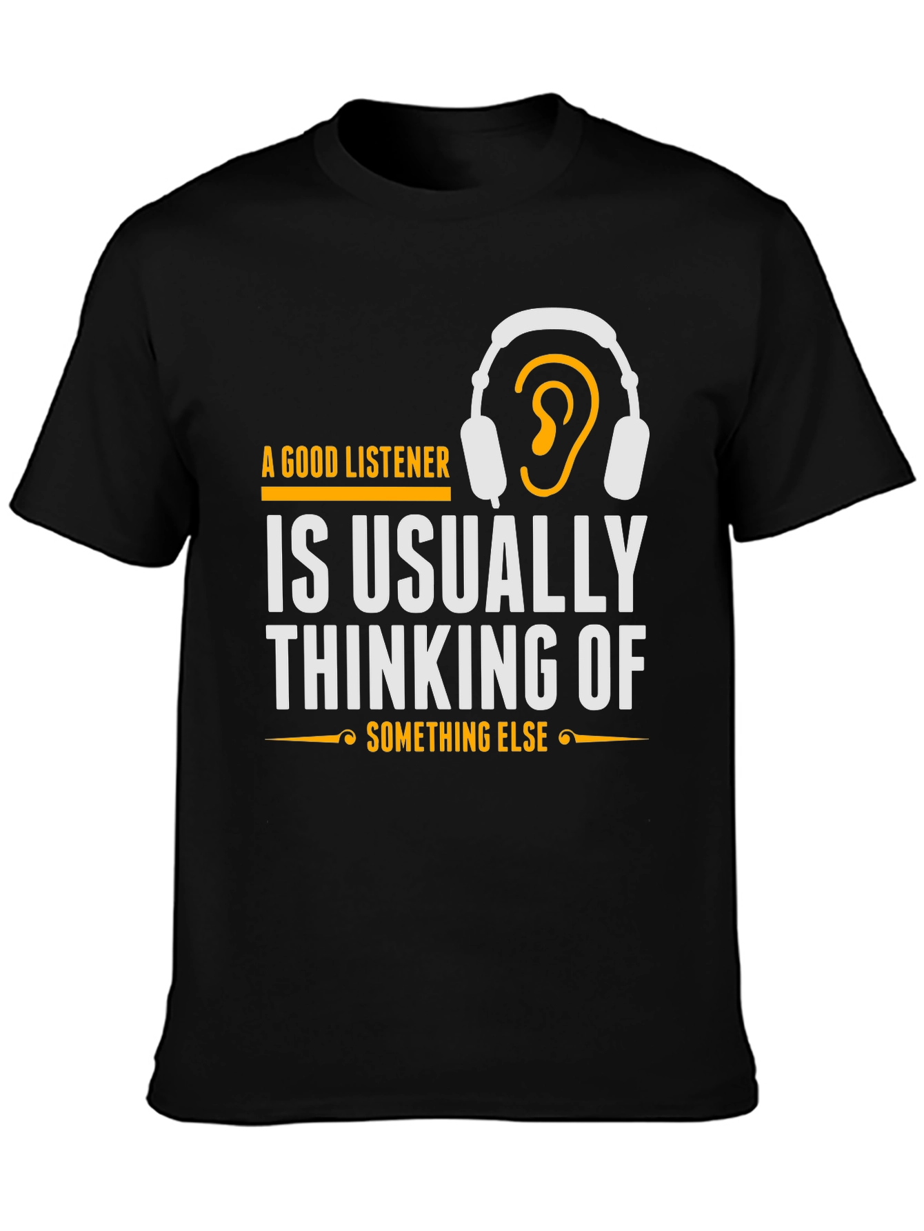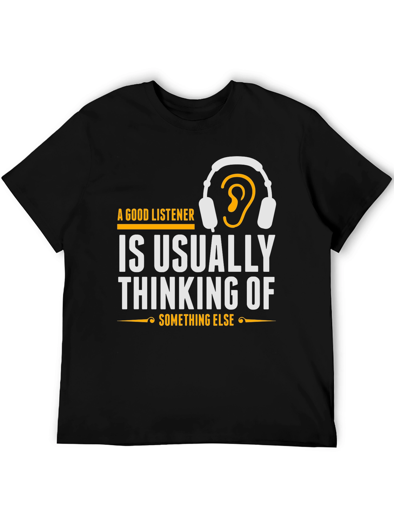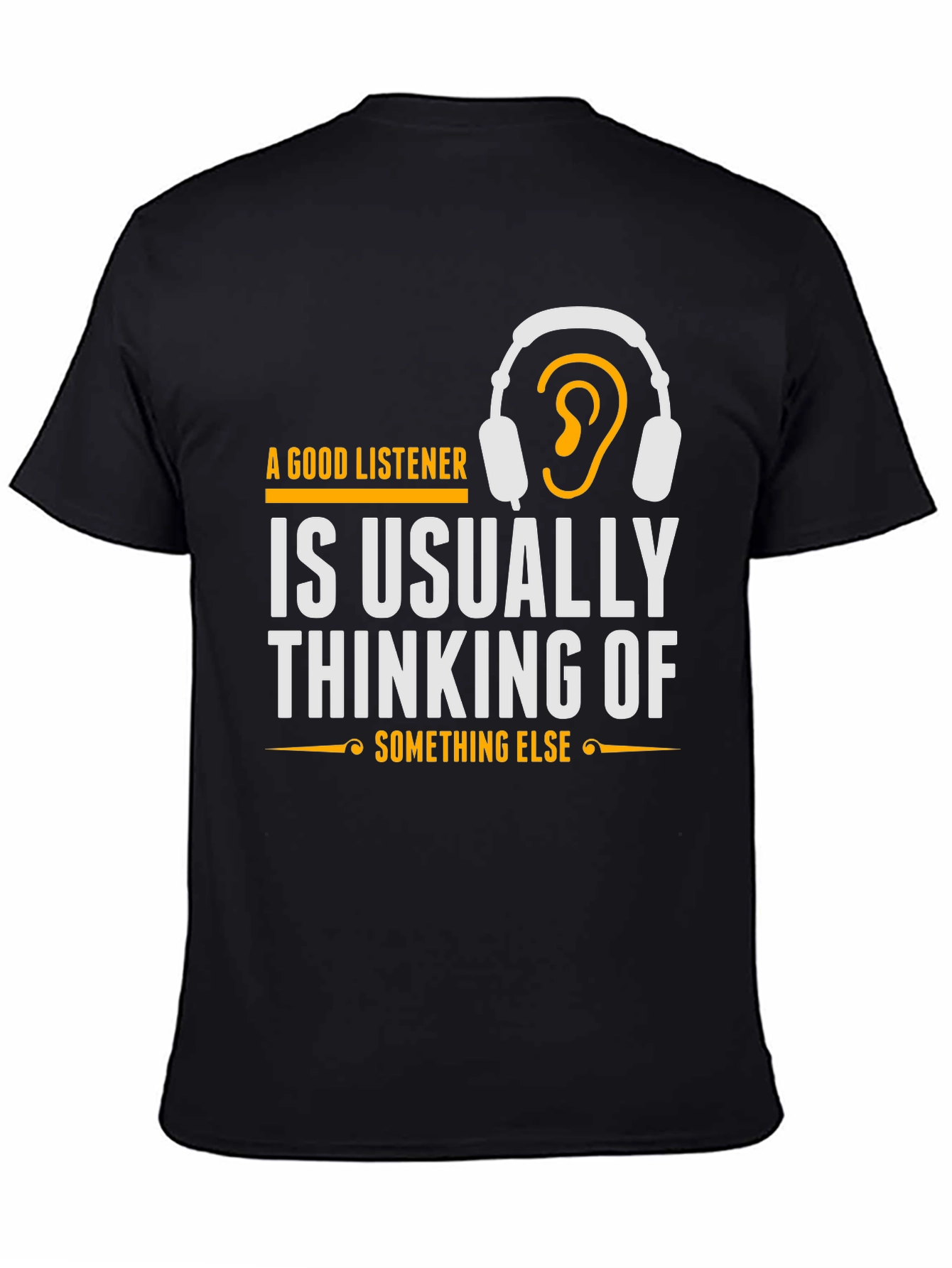 Esta camiseta negra de manga corta presenta un diseño llamativo e ingenioso. En el pecho, destaca la frase "A Good Listener is Usually Thinking of Something Else" (Un Buen Oyente Piensa en Otra Cosa), impresa en letras blancas y acentuada con detalles dorados, incluyendo un dibujo de auriculares con una oreja dentro. El diseño es moderno y atractivo, ideal para aquellos con sentido del humor o interés en psicología. Confeccionada con un material suave y cómodo, esta camiseta es perfecta para usar a diario. Su corte clásico la hace versátil para combinar con jeans, pantalones cortos o faldas. Es una excelente opción para expresar tu personalidad y destacar con un toque original. Demuestra que incluso cuando pareces estar escuchando, ¡tu mente puede estar en otra parte!