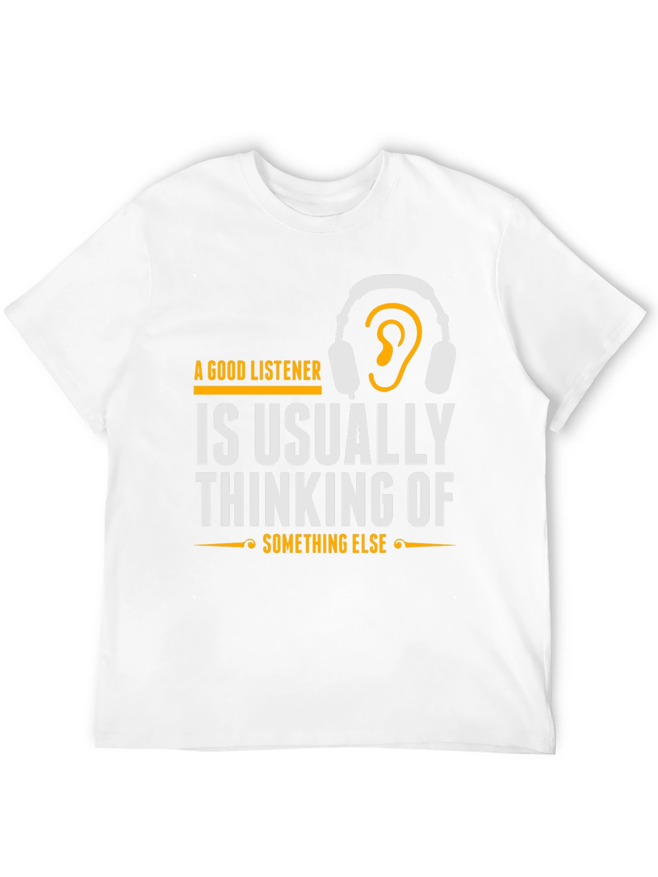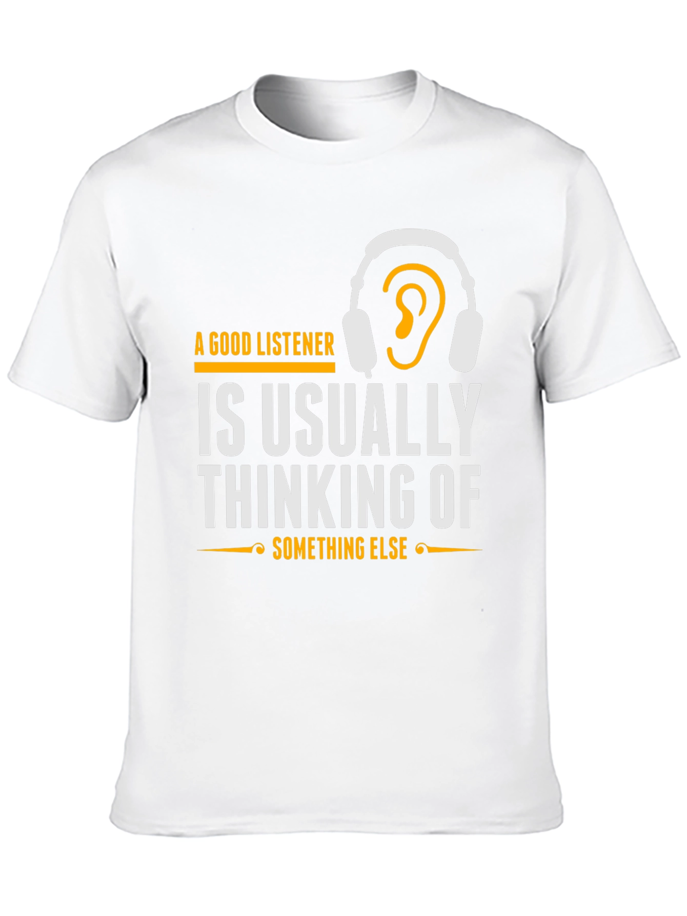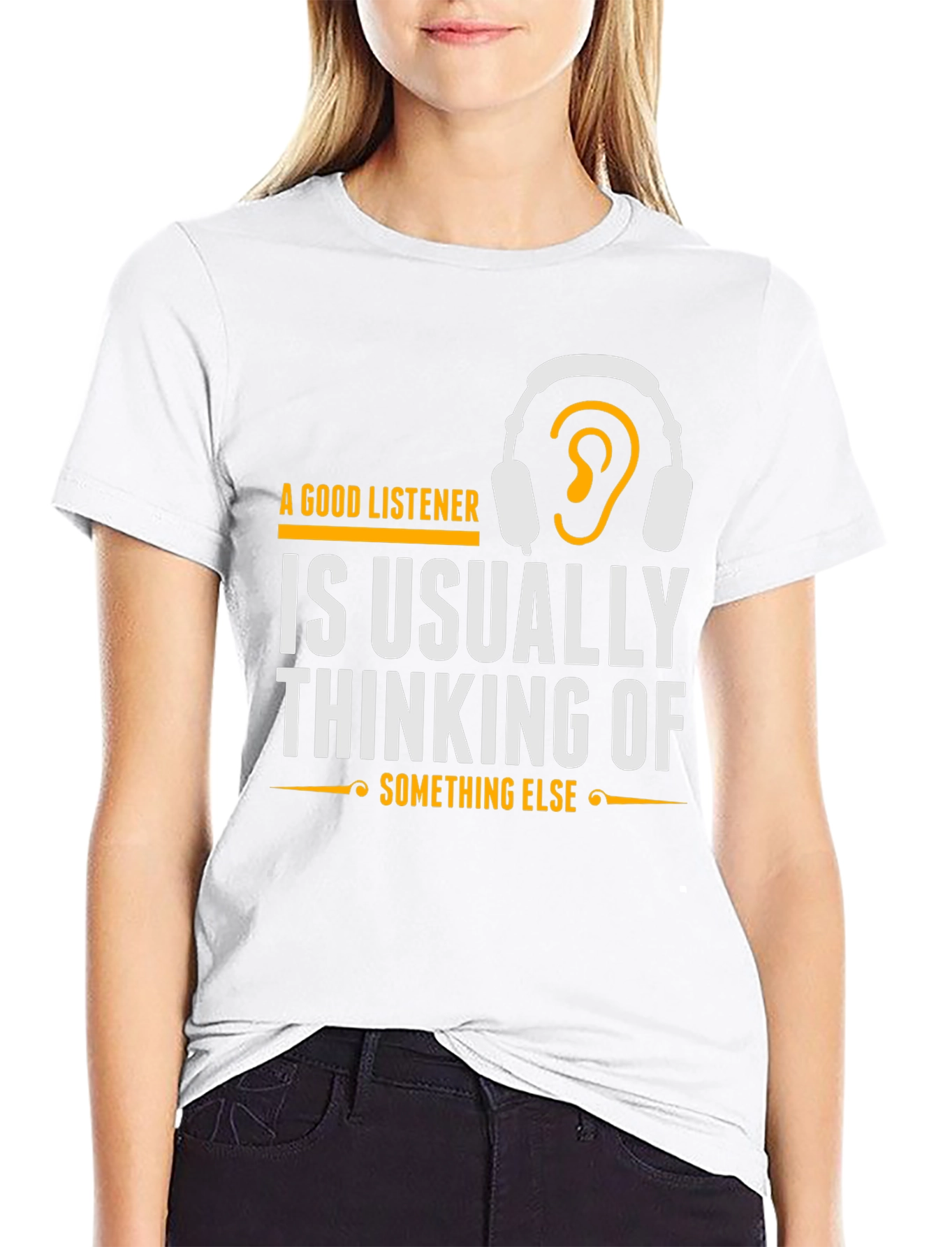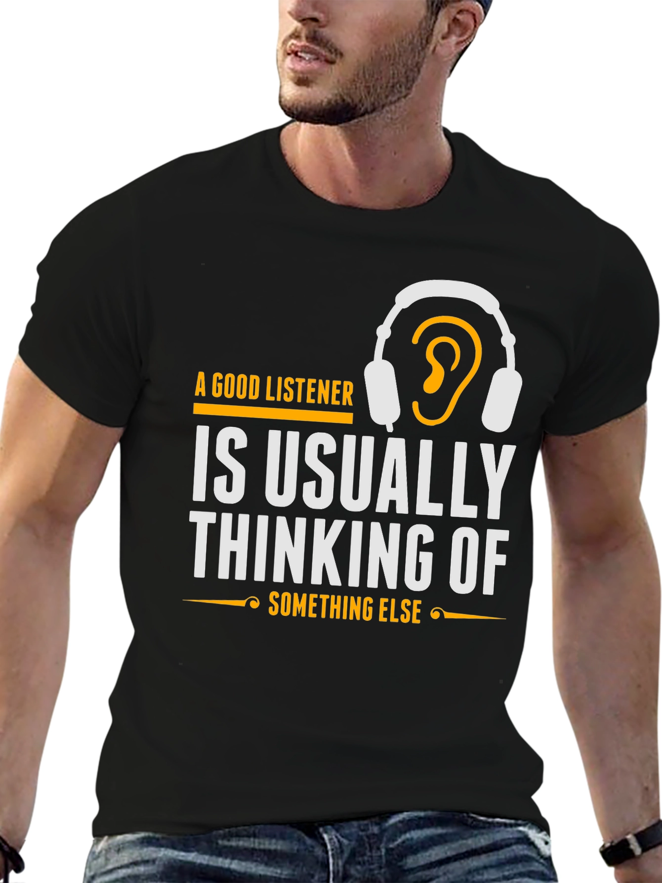 Esta camiseta negra de manga corta presenta un diseño llamativo e ingenioso. En el pecho, destaca la frase "A Good Listener is Usually Thinking of Something Else" (Un Buen Oyente Piensa en Otra Cosa), impresa en letras blancas y acentuada con detalles dorados, incluyendo un dibujo de auriculares con una oreja dentro. El diseño es moderno y atractivo, ideal para aquellos con sentido del humor o interés en psicología. Confeccionada con un material suave y cómodo, esta camiseta es perfecta para usar a diario. Su corte clásico la hace versátil para combinar con jeans, pantalones cortos o faldas. Es una excelente opción para expresar tu personalidad y destacar con un toque original. Demuestra que incluso cuando pareces estar escuchando, ¡tu mente puede estar en otra parte!