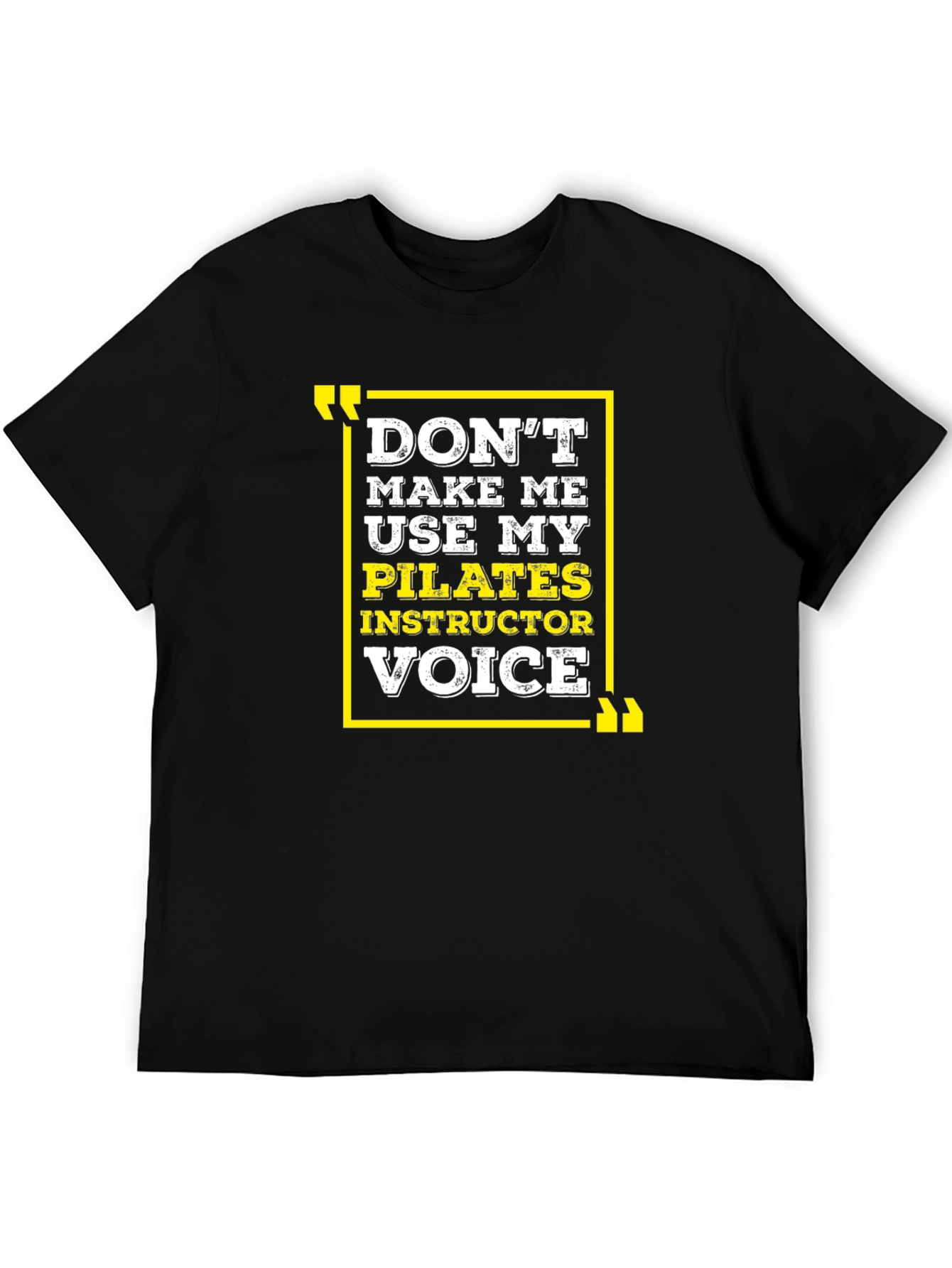 Esta camiseta negra de manga corta presenta un diseño llamativo y humorístico. Enmarcado en amarillo, el texto en blanco proclama: "NO ME HAGAS USAR MI VOZ DE INSTRUCTOR DE PILATES", resaltando "PILATES" en amarillo para enfatizar. La camiseta parece ser de algodón, ofreciendo comodidad y durabilidad. Perfecta para los amantes del pilates con sentido del humor, esta camiseta es ideal para llevar a clase, a eventos deportivos, o simplemente para un look casual y original en el día a día. Expresa tu pasión por el pilates con esta prenda única y divertida.
