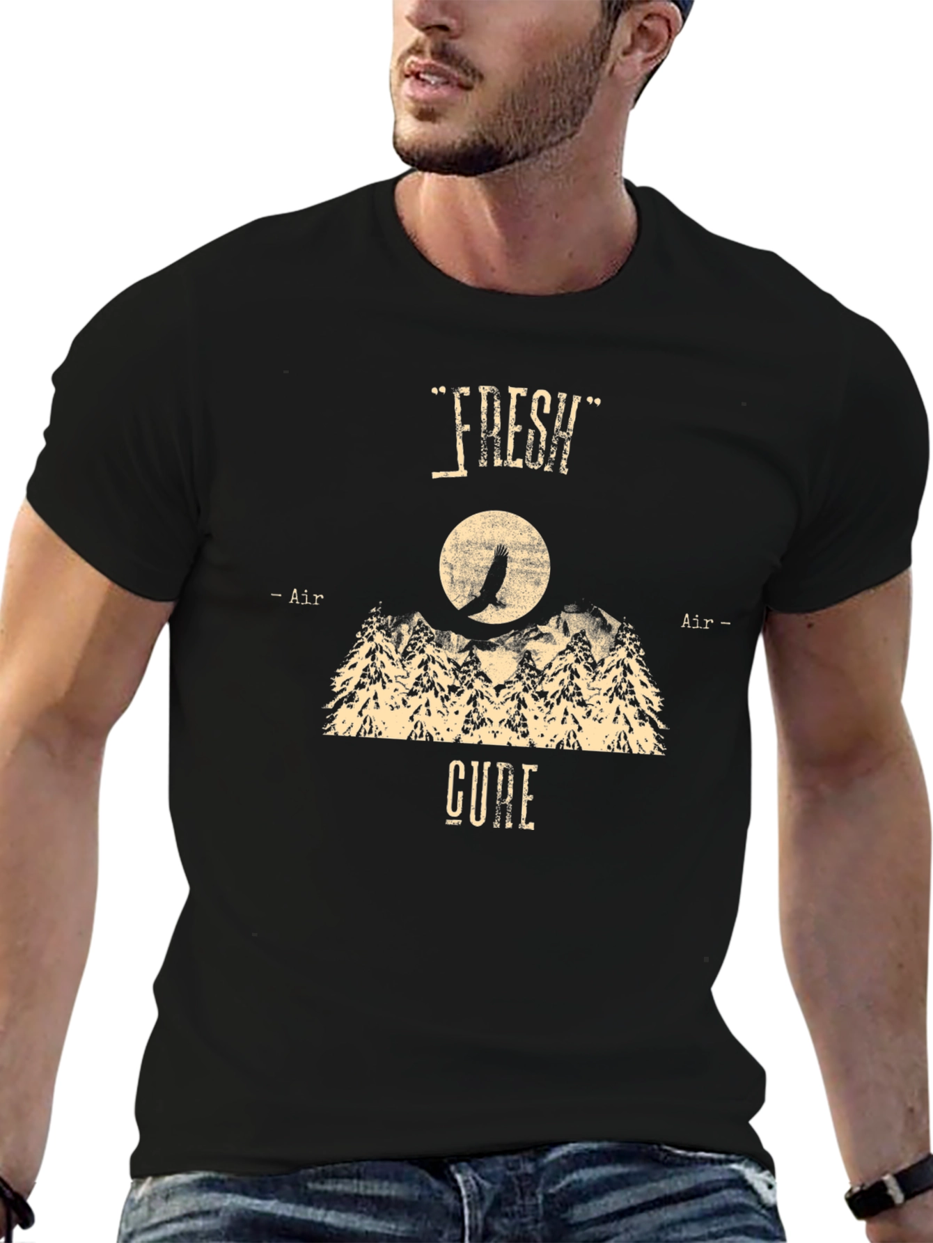 Esta camiseta negra presenta un diseño llamativo con la frase "Fresh Air Cure". En el centro, se observa una ilustración de montañas y pinos con un ave silueteada frente a una luna llena, evocando una sensación de aventura al aire libre. La camiseta es ideal para aquellos que buscan un estilo casual pero con un toque distintivo. Perfecta para usar en actividades al aire libre o para un look relajado en el día a día. Su diseño único te hará destacar. ¡Consigue la tuya y disfruta de la frescura del aire puro!
